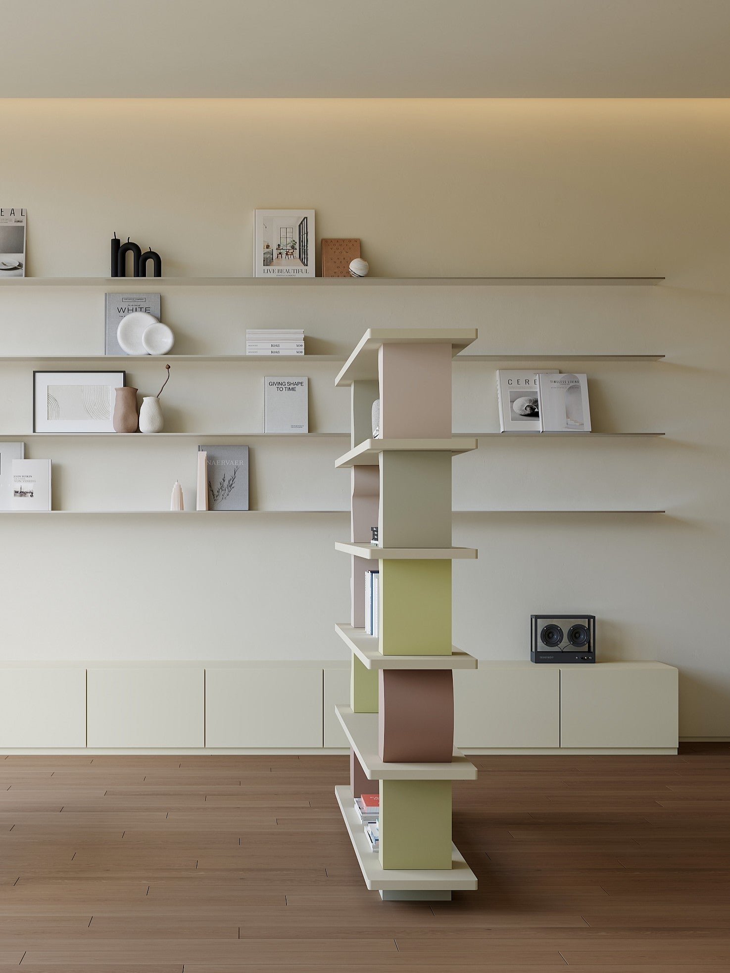 A free-standing shelving for books and objects. Its sculptural shelf blocks capture the silhouette of nature, bringing a unique visual appeal.
